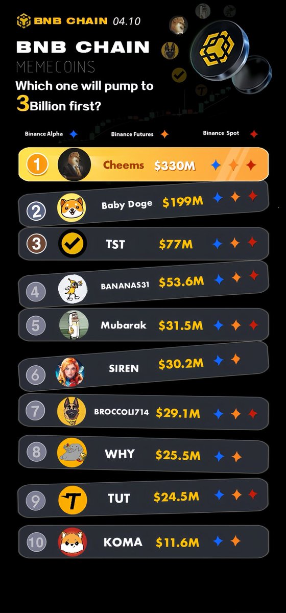 DAY11: BSC had a strong rebound last night But it all dropped back this morning Last night, added a thousand of Mubarak, reaching the initial entry point Currently, CZ and the first lady are not talking much about BSC, possibly feeling tired in the short term Currently still holding $Cheems Mubarak Broccoli tst four positions, waiting for a BSC season 🥹