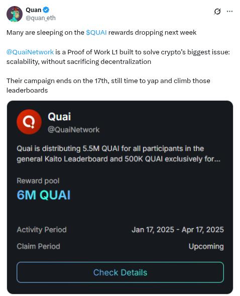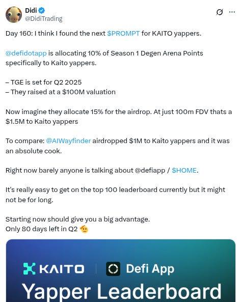 -Much speculation about the next big airdrop for Yappers, with current programs from @defidotapp and @QuaiNetwork generating attention, h/t @DidiTrading and @quan_eth: