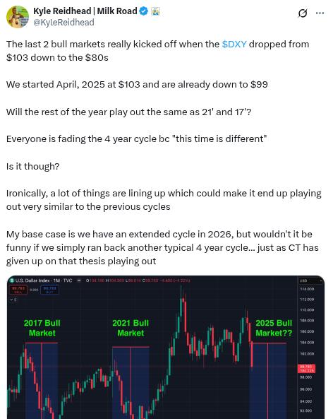 -Much focus on the dollar/DXY and whether an imminent drop in it could catalyze the next bull cycle upward, h/t @KyleReidhead: