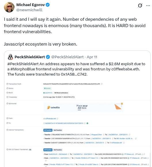 -Security alert from @PeckShieldAlert and @newmichwill on a $2.6M loss from MorphoBlue frontend vulnerability yesterday: