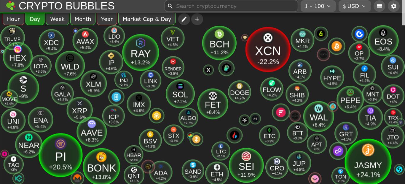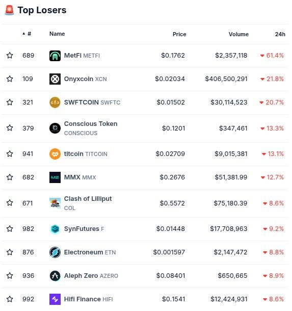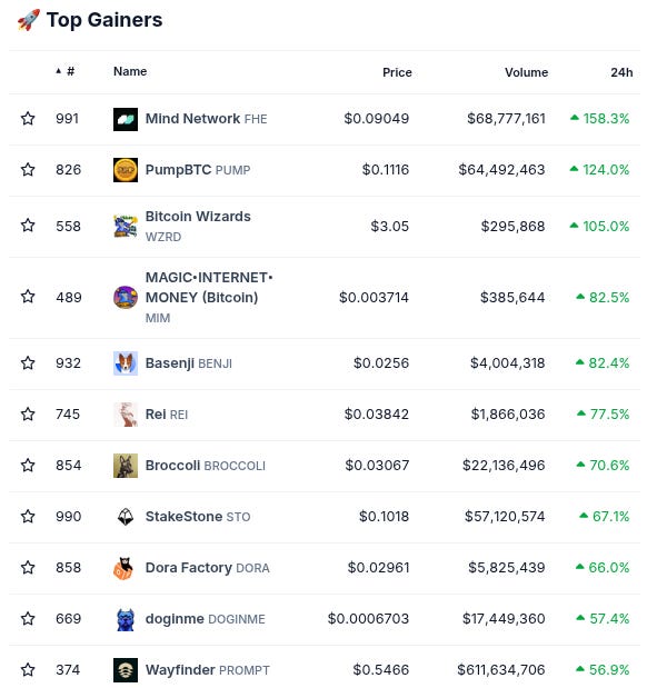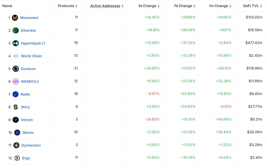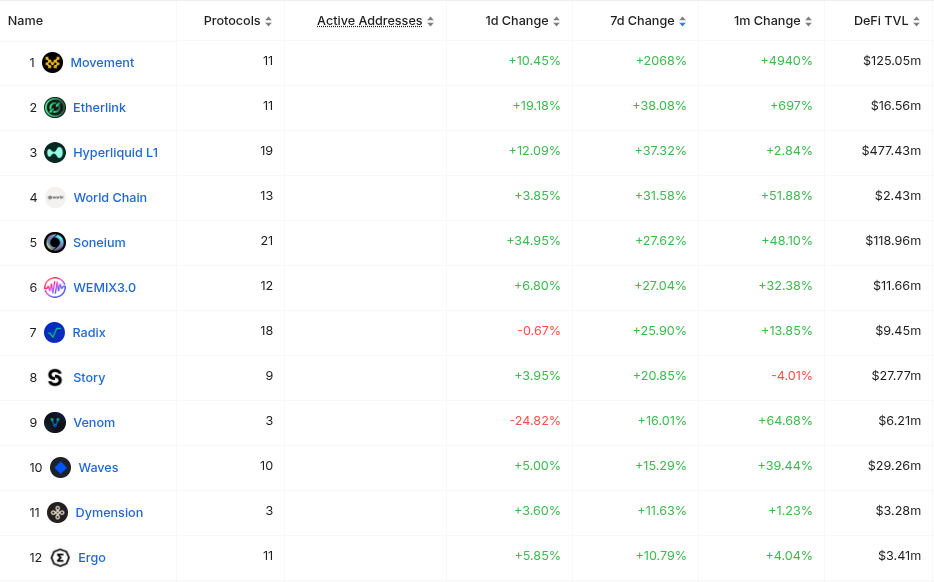 Chains are mixed today as well. Top 50 chains up at least 10% on the weekly include Hyperliquid L1 (#15), Movement (#37), and Soneium (#39).