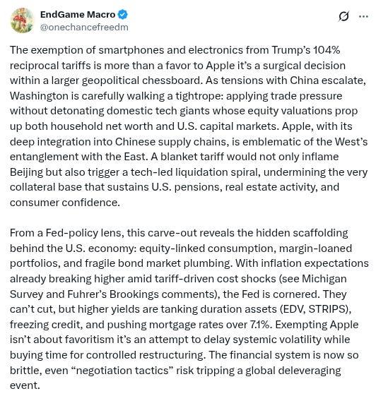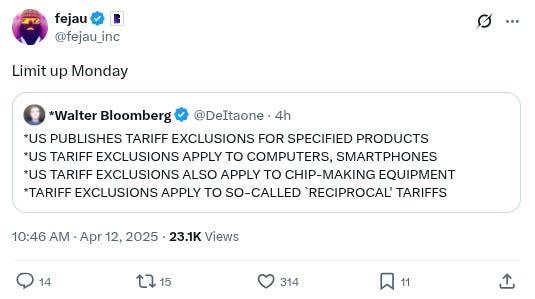 -Trump announced some additional tariff exclusions today, as the administration pulls back even more from the extreme tariffs that crashed markets over the last two weeks, h/t @fejau_inc and @De1taone: