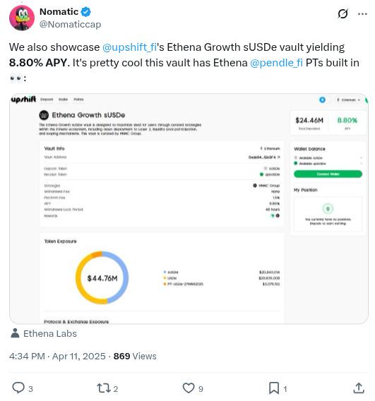 And click here or check out the tweet below from @Nomaticcap for more info on Upshift’s Ethena Growth sUSDe vault, currently earning 8.80% and managed by MNNC Group!