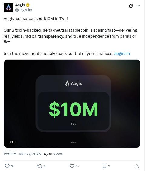 -A new/newish project called @aegis_im has been added to @DefiLlama, categorized as a basis trading protocol on ETH Mainnet and BSC. Twitter bio states “Bitcoin-backed stablecoin with real-time transparency, built-in yield generation, and complete independence from the fiat banking system”. Followed by 4 of our mutuals.