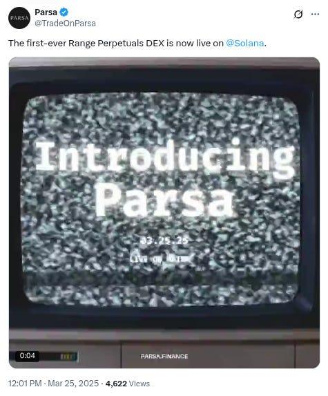 -New project called @TradeOnParsa. Twitter bio states “Range Perpetuals DEX — more powerful than perps, easier than options.” Followed by 10 of our mutuals. h/t @0xMughal: