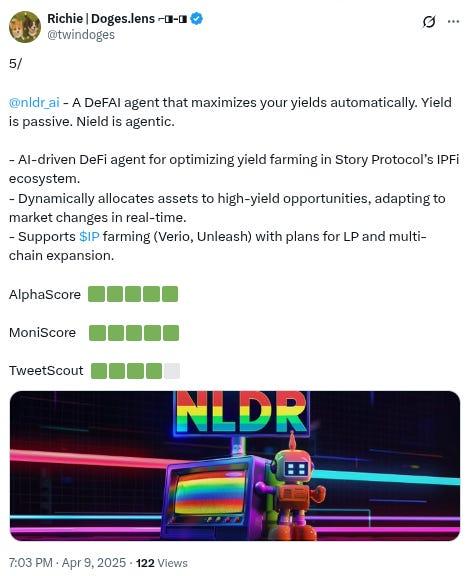 -New project called @nldr_ai. Twitter bio states “A DeFAI agent that maximizes your yields automatically. Yield is passive. Nield is agentic.” Followed by 3 of our mutuals. h/t @twindoges:
