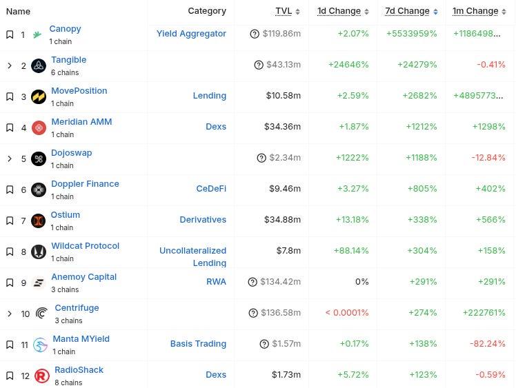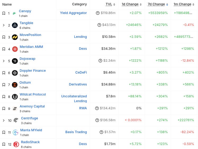 Here’s The Top 12 Fastest-Growing Protocols By TVL On The Weekly With At Least $1M TVL (from @DefiLlama):