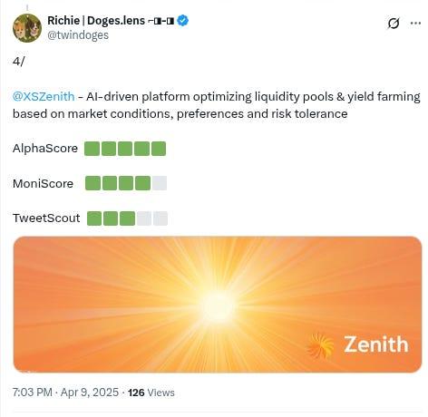 -Something new called @XSZenith. Twitter bio states “AI-driven platform optimizing liquidity pools & yield farming based on market conditions, preferences and risk tolerance”. Followed by 3 of our mutuals. h/t @twindoges: