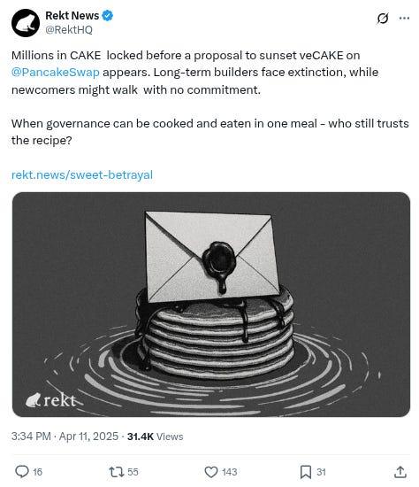 -Good article from @RektHQ about the ongoing Pancakeswap saga around potentially sunsetting veCAKE and the effect on @Cakepiexyz_io and etc: