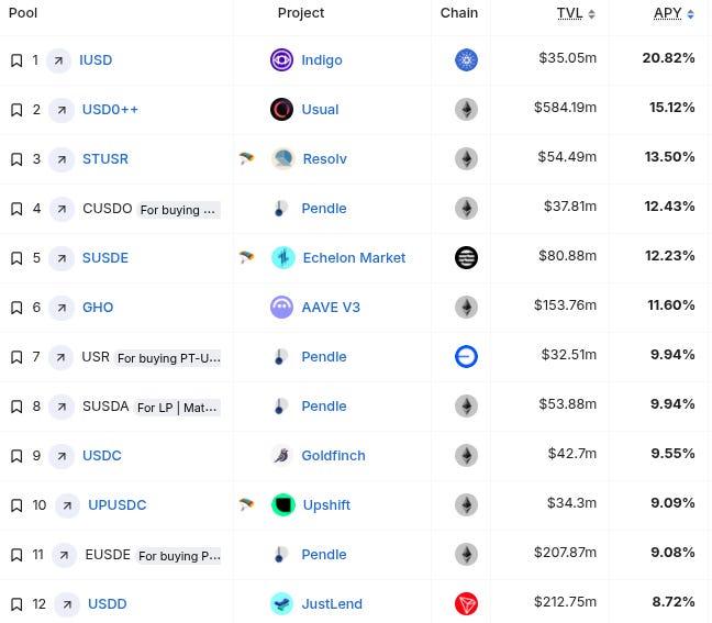 (note: these are the top Stablecoin Yields, sourced from @DefiLlama (single-exposure, no-IL, $25M+ TVL only) - note: these lists are just raw data, make sure to always DYOR before interacting with any/all protocols)
