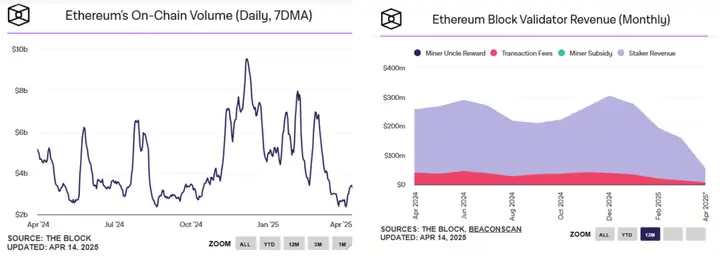 The daily average transaction volume on the Ethereum chain is below $3 billion, and coupled with the coin price impact, the monthly income of mainnet validators in March dropped below $200 million. From an investor sentiment perspective, the lower on-chain opportunities have led some investors to adopt a wait-and-see attitude towards Ethereum's short-term growth potential.