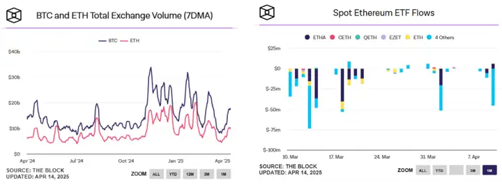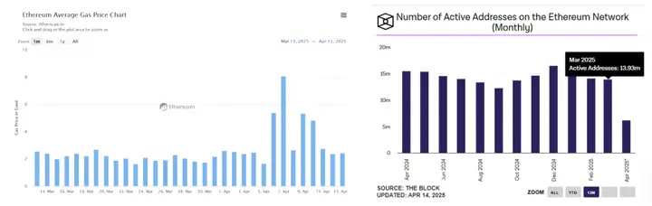 In the past month, except for the market crash on April 7, the mainnet Gas has long maintained a level of 2 Gwei, reflecting a decline in on-chain activity. Additionally, the monthly active addresses on the Ethereum mainnet have been in a fluctuating trend, with active addresses below 15 million in March.