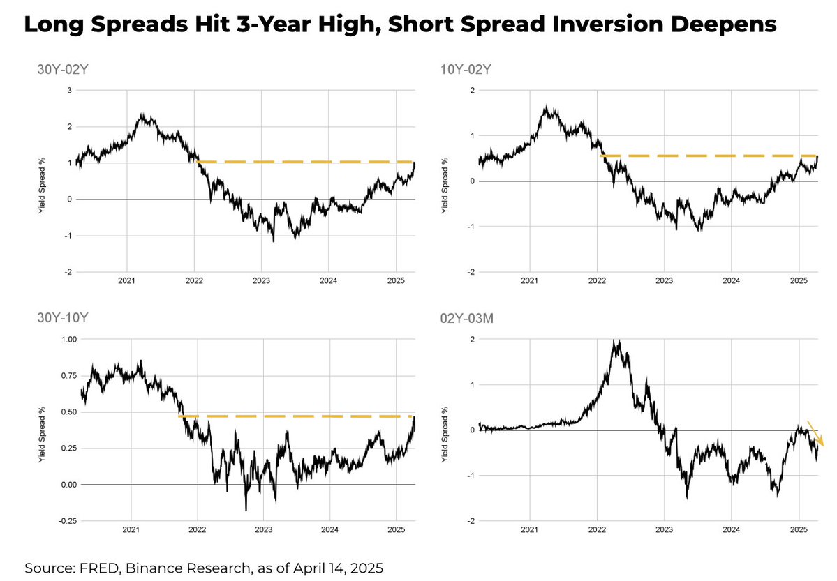 We're seeing pronounced "bear steepening" since last fall — long-term bond yields (10Y, 30Y) are rising faster than short-term ones (2Y, 3M). Spreads like 10Y-2Y and 30Y-2Y just hit 3-year highs, pointing to rising concerns around future growth and