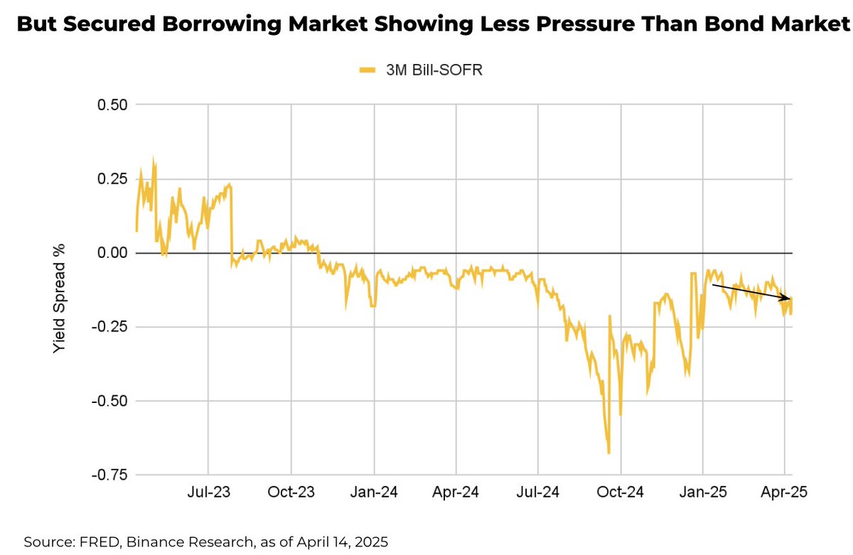 Despite broader stress, the spread between 3M T-bills and the Secured Overnight Financing Rate (SOFR) remains tight. This points to strong demand for ultra-safe, short-term government debt — a sign that investors are hoarding