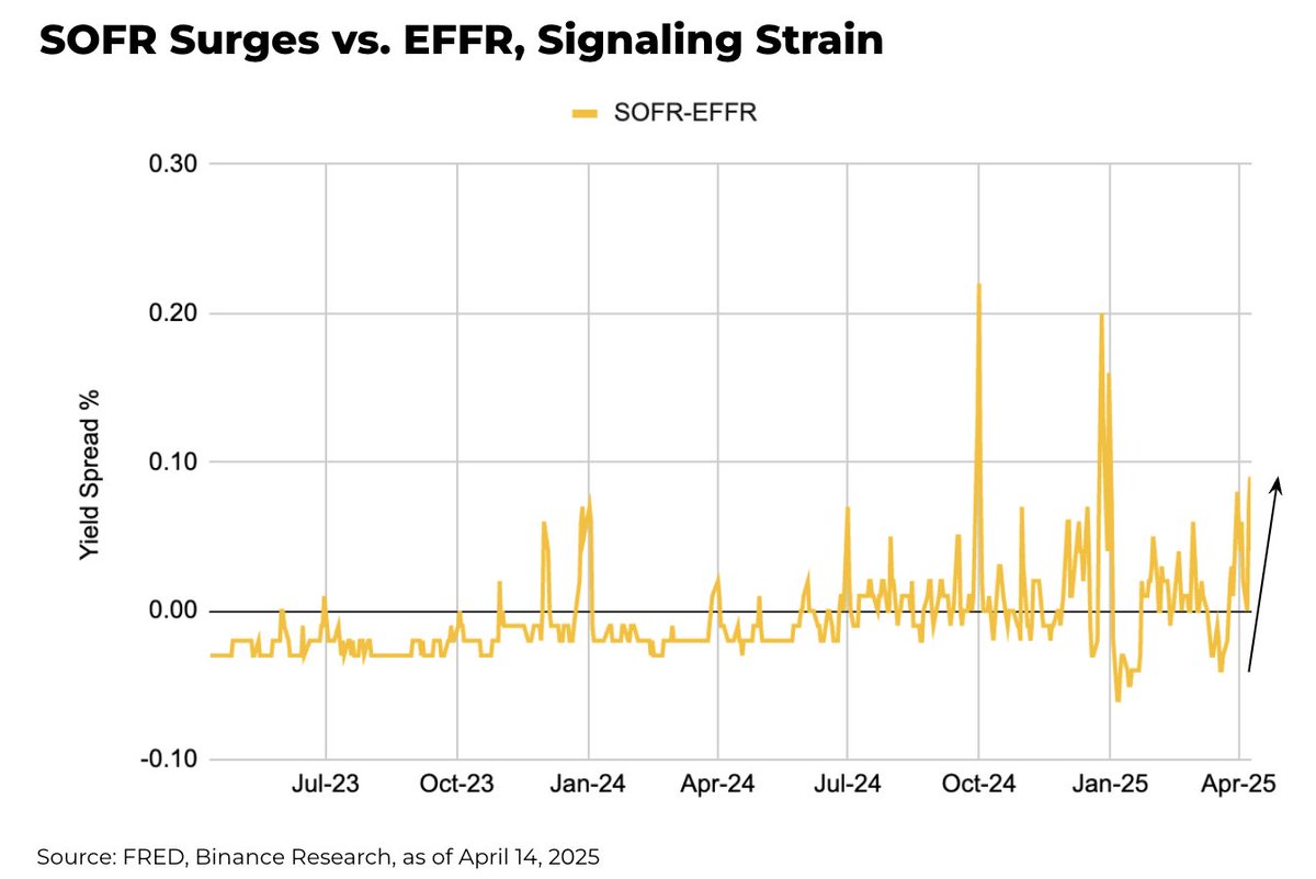 The cost of secured overnight borrowing (SOFR) is rising sharply relative to the unsecured interbank rate (EFFR, anchored by the Fed). The widening SOFR–EFFR spread signals stress in the repo market — hinting at growing tightness