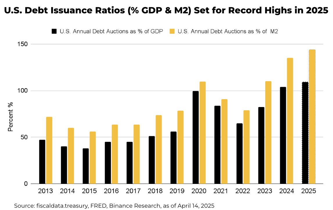 This massive issuance (~US$31T incl. refinancing) equals ~144% of the U.S. M2 and ~109% of GDP in 2025 — truly unprecedented. When supply this large hits the market, bond prices face pressure and yields rise —