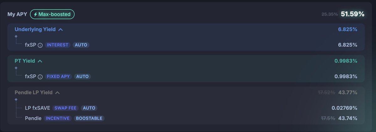 🧠Buy YT when the market long sentiment rises, betting on the increase in the underlying annualized rate (platform transaction fee) 💰In the opposite market or when pursuing stable returns, buy PT to lock in a fixed stablecoin annualized rate 😗LP: For the median of the underlying annualized rate of fxSAVE, dig $PENDLE Reward + Pendle pool transaction fee