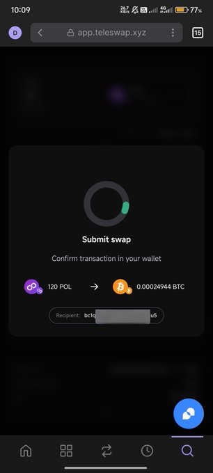 Tried swapping my polygon to btc using @Tele_Swap 's website http:/app.telezwap.xyz . It was really easy 👏 All you have to do is choose what chain you want to swap to btc & put your btc add. They support eth, base, poly, arb, bnb, opt, etc. Below is my ss of transaction.