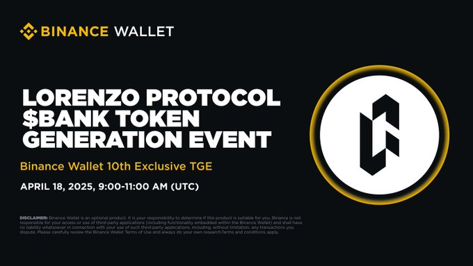 🚨Just in: Binance Wallet has announced the listing of @LorenzoProtocol ( $BANK), a new Token Generation Event (TGE) project, in partnership with @PancakeSwap. Users can participate with a maximum contribution of 3 $BNB. The event runs from April 18th, 9:00 to 11:00 UTC. • New
