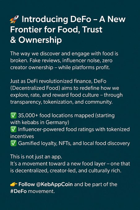 🚀 Introducing DeFo – A New Frontier for Food, Trust & Ownership The way we discover and engage with food is broken. Fake reviews, influencer noise, zero creator ownership — while platforms profit. Just as DeFi revolutionized finance, DeFo (Decentralized Food) aims to redefine