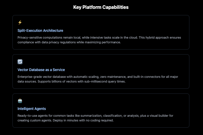 4/ Flexible execution, VectorDB as a service, access to leading AI models and templatized AI agents.