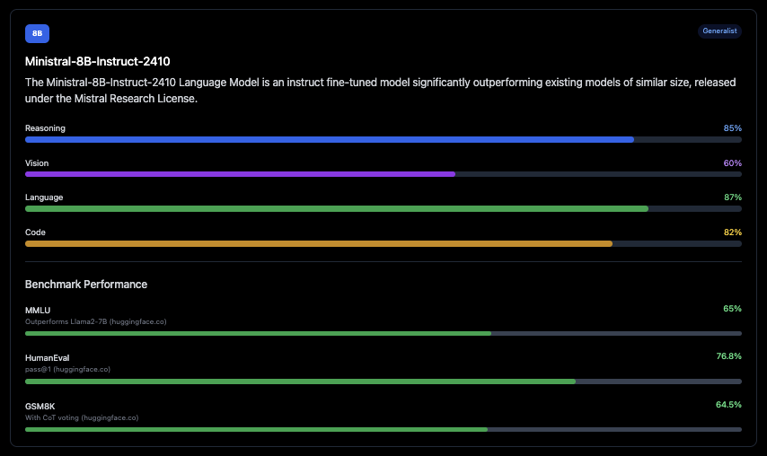 The Ministral-8B-Instruct-2410 Language Model is an instruct fine-tuned model significantly outperforming existing models of similar size, released under the Mistral Research License.