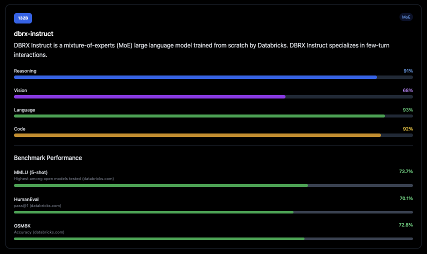 DBRX Instruct is a mixture-of-experts (MoE) large language model trained from scratch by Databricks. DBRX Instruct specializes in few-turn interactions.