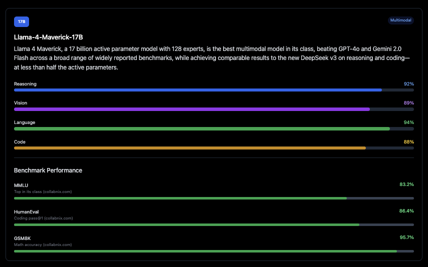 Llama 4 Maverick, a 17 billion active parameter model with 128 experts, is the best multimodal model in its class, beating GPT-4o and Gemini 2.0 Flash across a broad range of widely reported benchmarks.