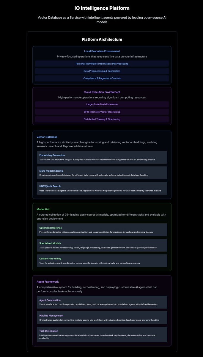 Meet IO Intelligence, a platform providing Vector Database as a Service, 25 open-source AI models, and specialized agents.