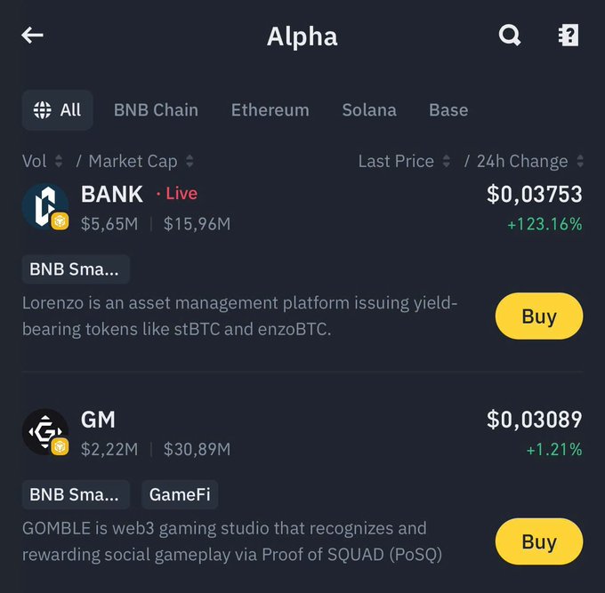 #Binance Announces the 41st batch of Spotlight Projects on Binance Alpha $BANK (@LorenzoProtocol) and $GM (@gomblegames) have been selected as the 41st of Binance Spotlight projects.