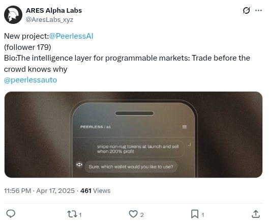 -Something new called @PeerlessAI. Twitter bio states “The intelligence layer for programmable markets: Trade before the crowd knows why @peerlessauto”. Followed by 8 of our mutuals. h/t @AresLabs_xyz: