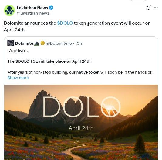 -Dolomite announced their TGE will take place on April 24th, to much excitement, h/t @leviathan_news:
