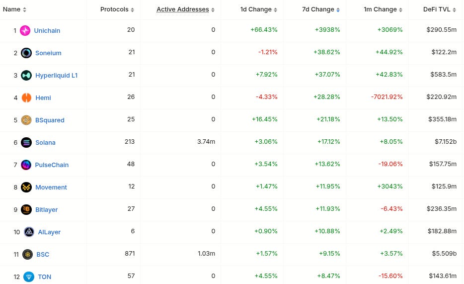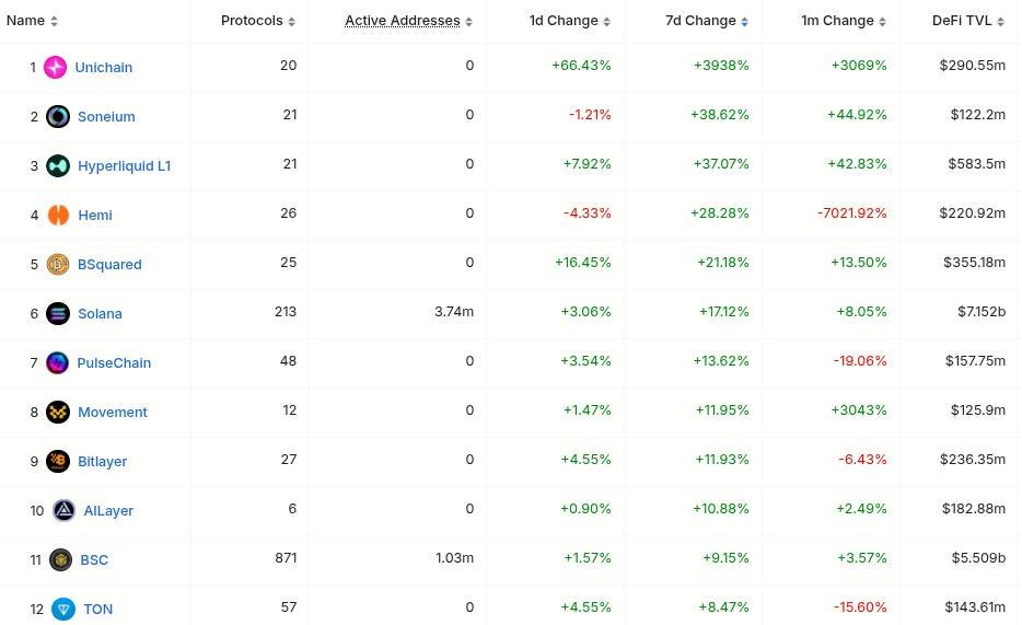Here’s The Top 12 Fastest-Growing Chains By TVL On The Weekly With At Least $100M TVL (from @DefiLlama):