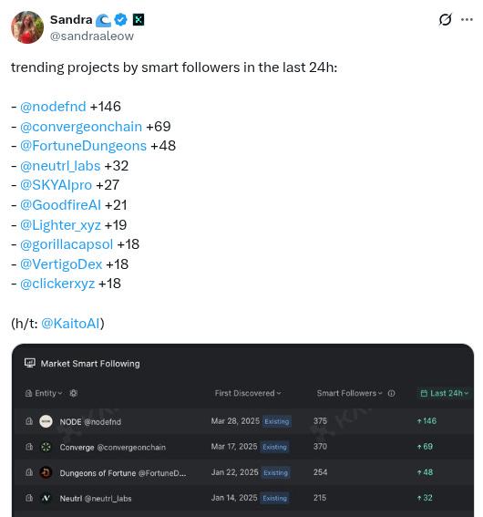 -Interesting data on Kaito’s trending projects by smart followers over the last 24 hours, h/t @sandraaleow: