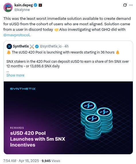 -@kaiynne and Synthetix announced token incentives to try to re-peg their $sUSD stablecoin, and are apparently looking at other solutions as well: