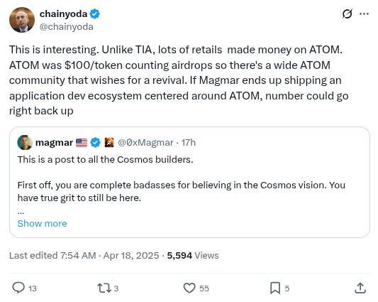 -Is there the possibility of an ATOM resurgence? h/t @chainyoda, quote-tweeting an @0xMagmar tweet that generated much attention: