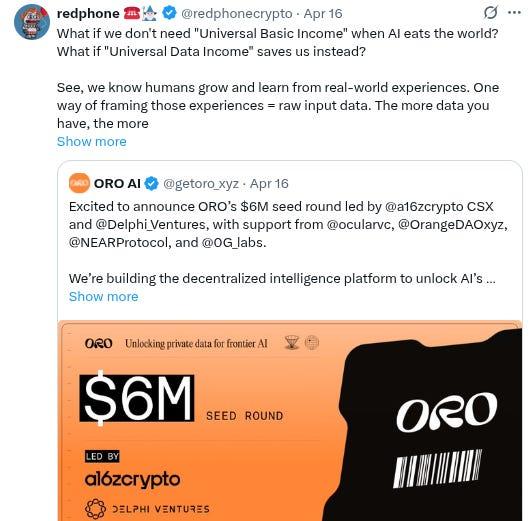 -New project called @getoro_xyz. Twitter bio states “Unlocking the world's premium data for frontier AI.” Followed by 31 of our mutuals. h/t @redphonecrypto: