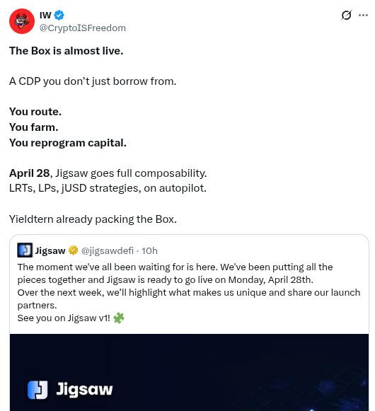 -Seeing a number of smart accounts we follow talk about @jigsawdefi’s newly announced launch on April 28th, example h/t @CryptoISFreedom: