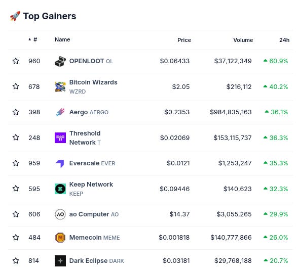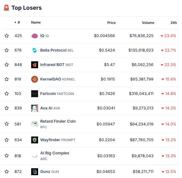 Protocols are also quite green today. Top 100 protocols down at least 10% on the weekly include Babylon (#12), Stargate Finance (#54), Zircuit Staking (#66), and BEX (#86).