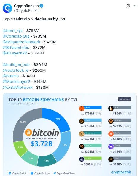 -Top 3 Bitcoin sidechains or L2’s are currently @hemi_xyz, @Coredao_Org, and @BSquaredNetwork, h/t @CryptoRank_io:
