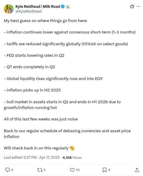 -Macro data is looking worse and worse, Powell is talking mega-hawkish, Trump is talking about firing Powell, and the tariff saga seems to have cooled a bit but is still unresolved, h/t @fejau_inc: