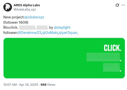 -New project called @clickerxyz. Twitter bio states “click. ░░░░░░. ░░░░. by @daylight.” Followed by 12 of our mutuals. h/t @AresLabs_xyz: