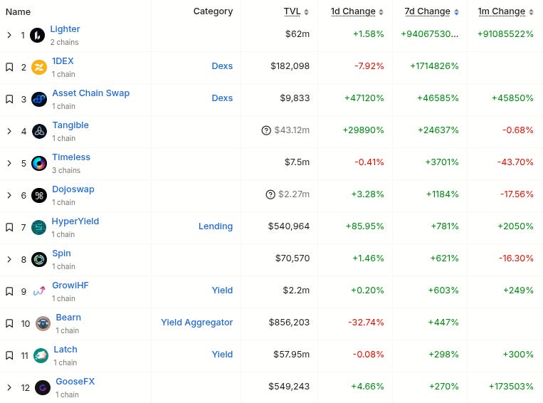 Here’s The Top 12 Fastest-Growing Protocols By TVL On The Weekly With At Least $100M TVL (from @DefiLlama):