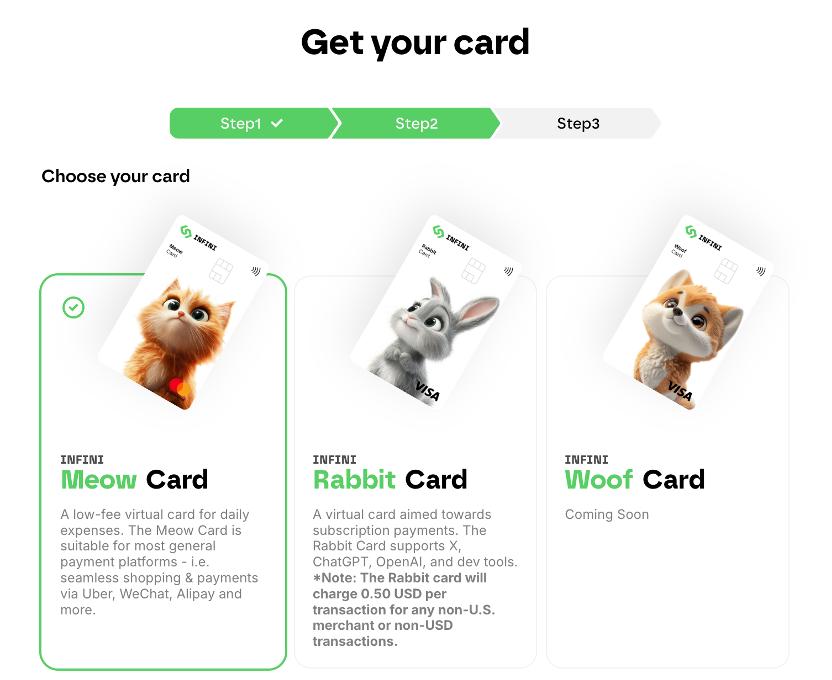 Infini has three different cards: Meow Card and Rabbit Card are core virtual card products , providing flexible on-chain payment and daily consumption solutions for different user needs. Currently, both cards are sold at a price of US$9.9, with no annual or monthly fees, and support binding with Alipay and WeChat Pay . It is one of the few overseas virtual card products compatible with mainstream payment tools for Chinese users.