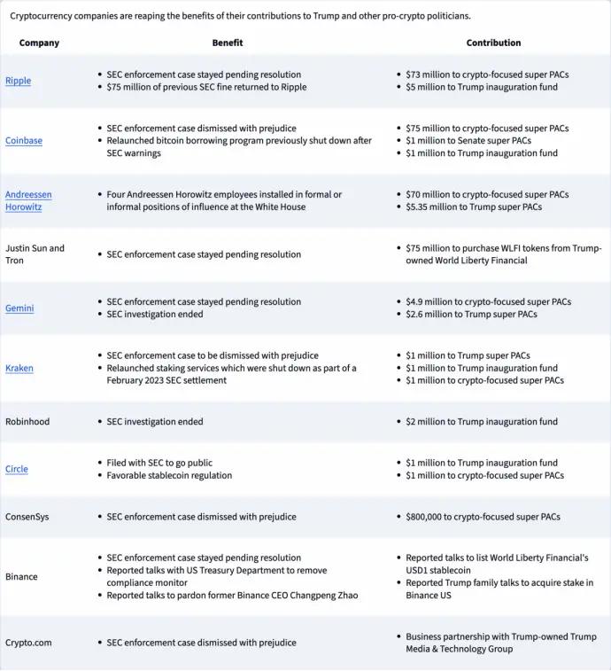 These financiers were rewarded with policies: at least eight U.S. Securities and Exchange Commission (SEC) enforcement cases against crypto companies were withdrawn or suspended. Many companies were also included in the new rule-making process, taking the opportunity to tailor market rules for themselves in an environment with a lack of supervision, low compliance requirements, and weak consumer protection.