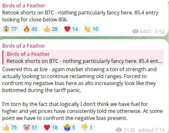 ChainCatcher reports that top trader Eugene Ng Ah Sio posted in his personal channel, saying, "I have closed the Bitcoin short position I opened this morning at the break-even point. The market has once again demonstrated strong momentum and is actually continuing to recover previous trading ranges. I must confront my bearish bias, especially during the tariff panic period, as Altcoins seem to have bottomed out. I am currently in a conflicting state: logically, I believe there is a lack of upward momentum, but price trends continue to deny this judgment. Ultimately, I need to face this deeply rooted bearish tendency."