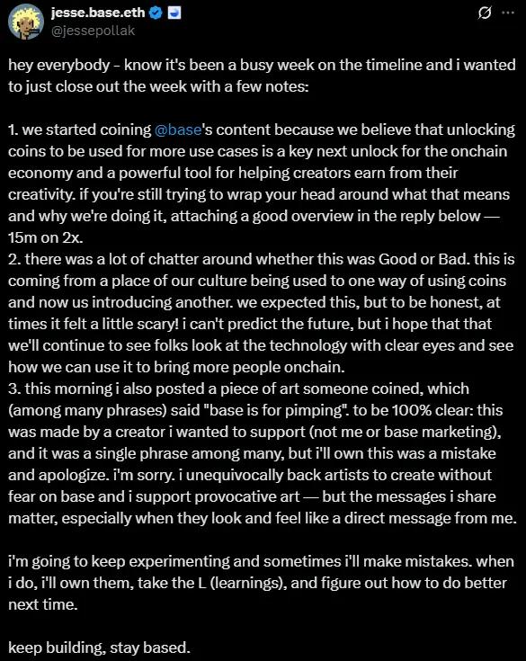 Jesse Pollak further stated that the previously published work was created by other creators, not by himself, and reiterated that he still hopes to support artists creating on Base, but will be more careful about the information he shares in the future, especially when the information is not directly from himself.