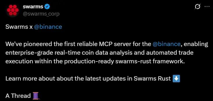 ChainCatcher reports that AI agent protocol Swarm launched Binance MCP server to achieve token data analysis and automatic trading execution within the production-ready swarms-rust framework.