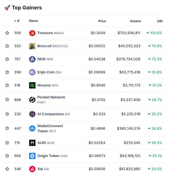 Protocols are also mixed today. Fastest-growing protocols on the weekly with at least $1M TVL are Tangible, Manta MYield, GrowiHF, Bearn, and Napier.