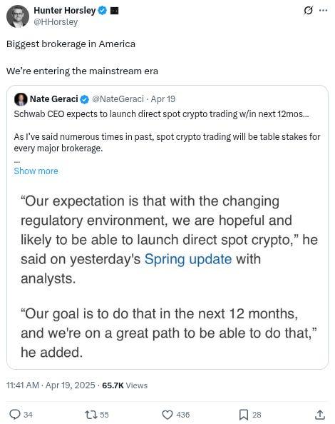 -Schwab expects to offer crypto spot trading within the next 12 months, h/t @HHorsly and @NateGeraci: